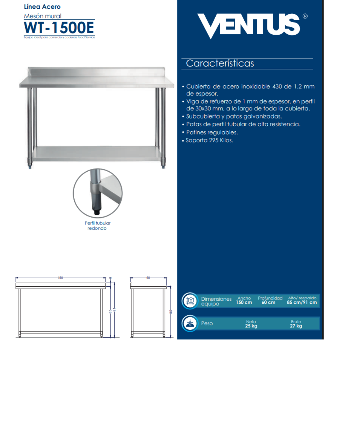 La Serie E de Ventus es la solución estándar para cocinas que requieren higiene y eficiencia contra muro. Estas mesas están fabricadas en acero inoxidable de alta calidad y cuentan con un zócalo (respaldo) integrado, diseñado para proteger las paredes de salpicaduras y evitar que restos de comida caigan tras el mueble. Es una superficie de trabajo robusta, fácil de limpiar y esencial para cualquier área de preparación profesional.