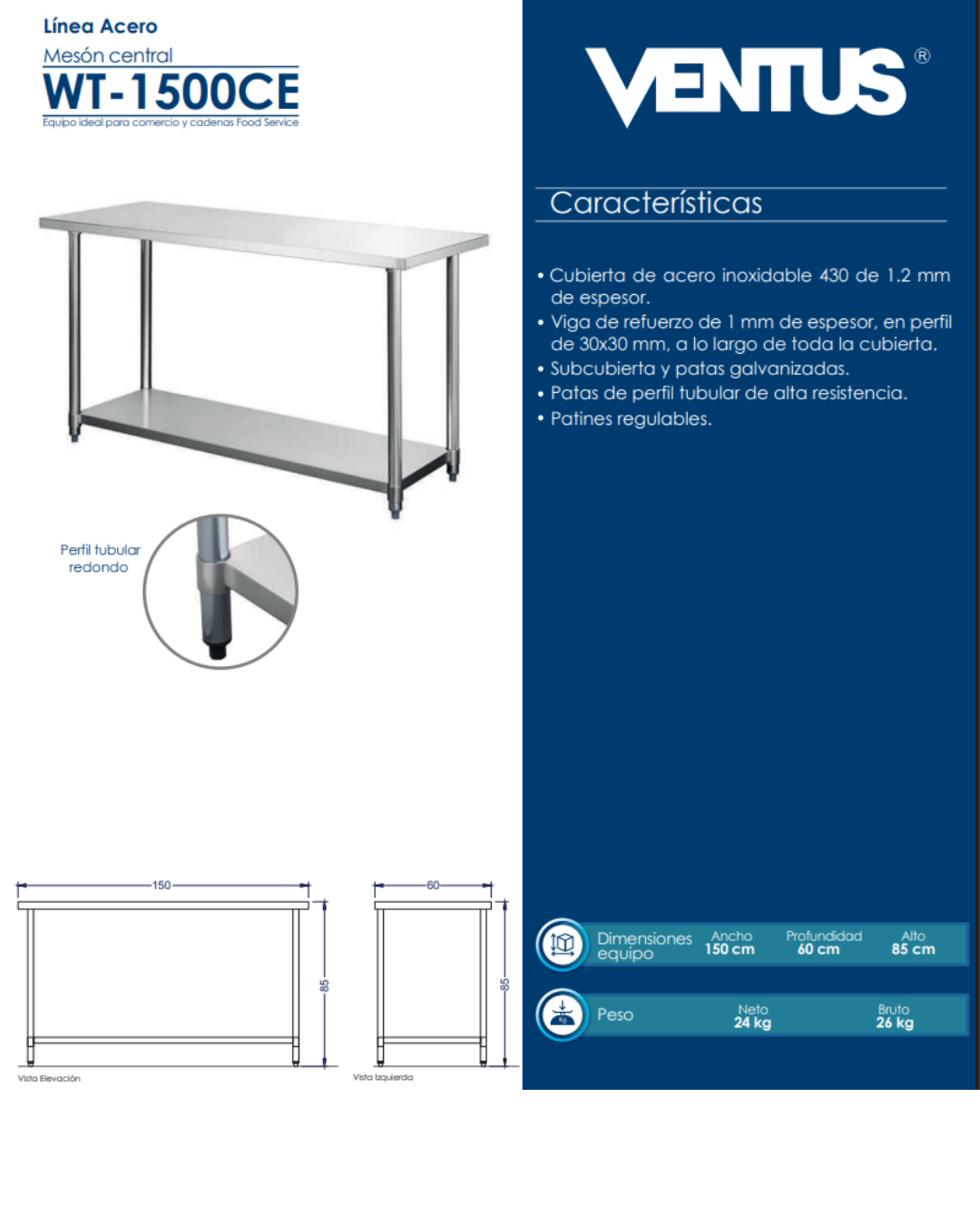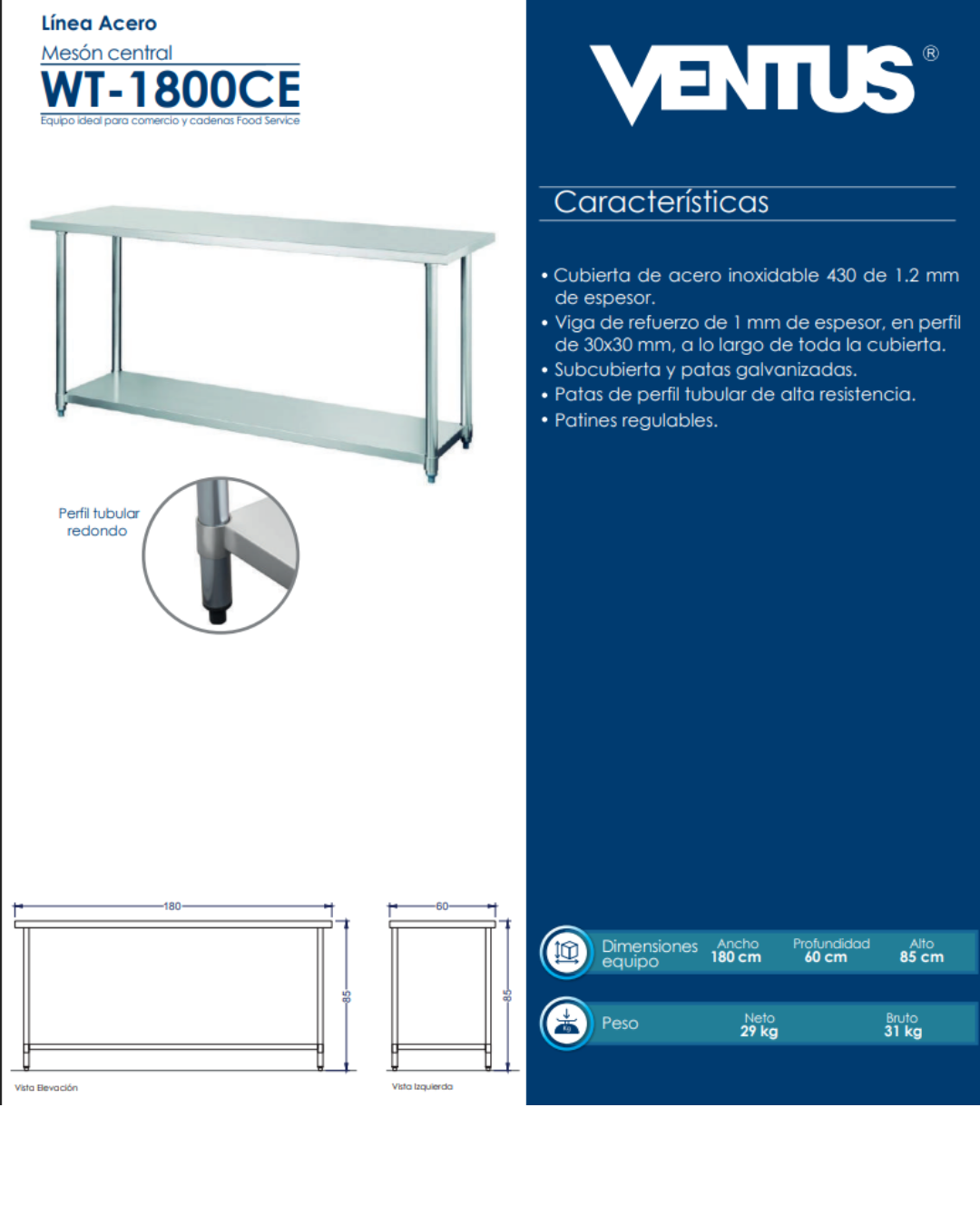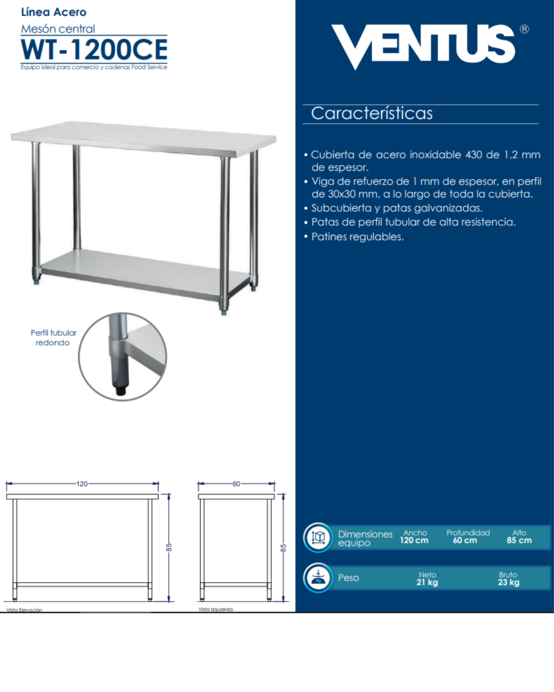 La Serie CE de Ventus está diseñada para maximizar la operatividad en el centro de la cocina. Al no poseer zócalo, permite el acceso desde sus cuatro costados, convirtiéndose en una isla de trabajo perfecta para que varios operarios trabajen simultáneamente. Su estructura reforzada y terminaciones sanitarias la hacen ideal para laboratorios, panaderías y áreas de emplatado donde la versatilidad de movimiento es clave.